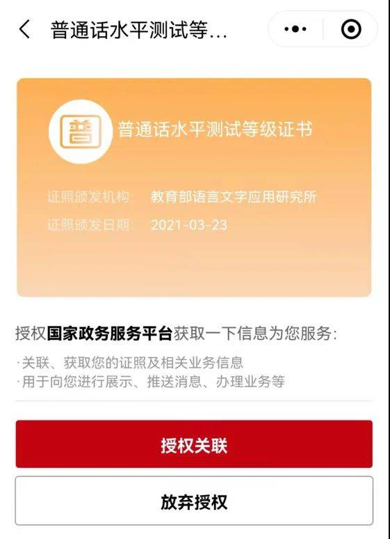 目前,“国家政务服务平台”已上线普通话水平测试等级证书。凡是在“全国普通话培训测试信息资源网”能查询到成绩的考生均可通过“国家政务服务平台”APP、微信小程序、支付宝小程序绑定电子证书。纸质证书由原测试站发放。
