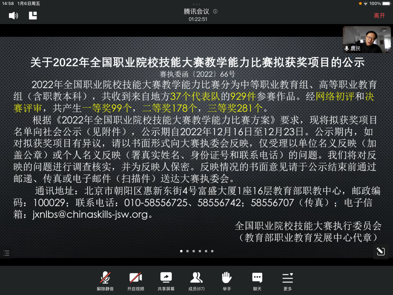 教务处于2023年1月开始启动2023年教学大赛工作,1月6日晚邀请魏民教授对2022年国赛方案进行了解读,魏教授是教育部第一届全国职业院校信息化教学指导委员会副主任,第一届全国职业院校信息化教学培训教学委员会主任,第一届到第八届教育部信息化教学能力大赛评判委员会副主任,中国高职高专数字教学资源建设委员会首席顾问,国家职业岗位核心能力精品课建设专家组长,中国教育技术学会虚拟仿真教学委员会首席顾问,北京信息职业技术学院副院长,国家首届教学成果一等奖获得者。