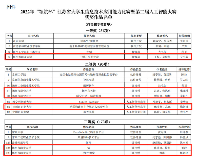 近日,江苏省教育厅公布了2022年“领航杯”江苏省大学生信息技术应用能力暨第二届人工智能比赛的获奖名单,我校共获奖6项:土木学院仝小芳老师指导的丁悦、吴航航学生微视频作品《一颗石头的使命》获一等奖,信息学院张光桃老师指导的吕远、焦思琪学生微视频作品《扬州东关街》、生化学院李银川老师指导的颜雨婷、柏杨学生微视频作品《隔空对话,精神传承》、电子学院梅妍玭老师指导的戴业航、高鹏学生人工智能创意类作品《地图构建自主导航无人驾驶小车》三个项目获二等奖,电子学院刘静老师指导的盛轶祖、徐帆学生微视频作品《信》、外国语学院杨新晓老师指导的魏琪学生微视频作品《反P小课堂》两个项目获三等奖。