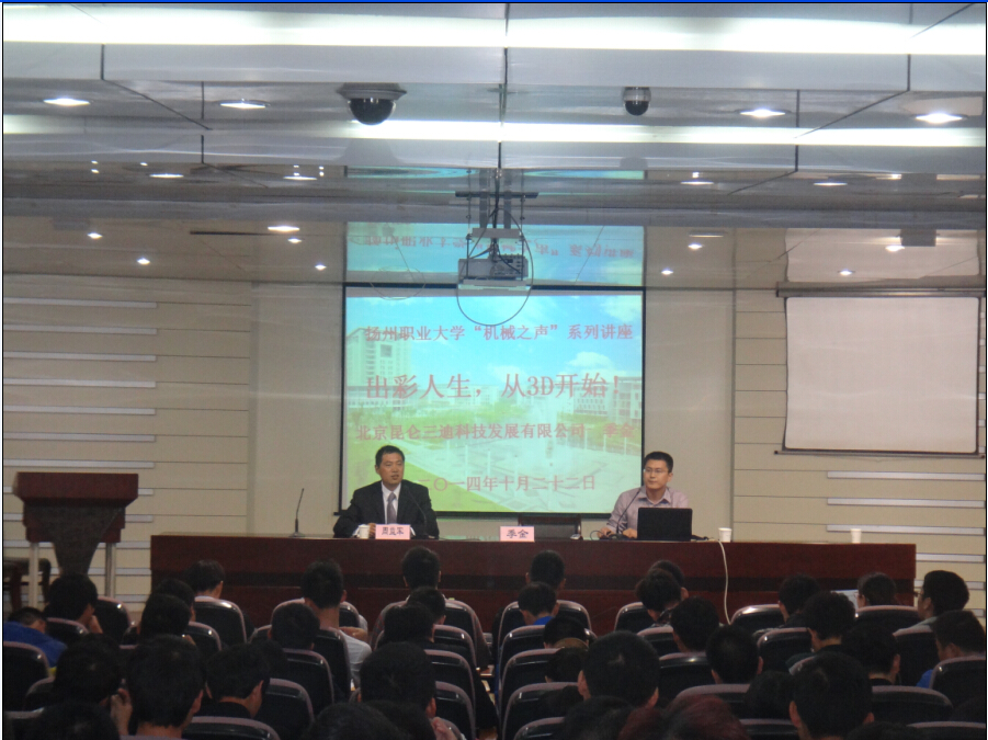 北京昆仑三迪科技发展有限公司高级经理季金做了整场的主讲,季金提出:以3D打印为代表的三维技术呼啸而至,传统的机械技术被取而代之,从而造成了国内制造业3D人才的缺失。从学生未来寻求工作的角度来看,熟练的掌握和应用3D软件无疑是给自身披上了强而坚毅的铠甲。季金运用立体感十足的视频向学生展示了“汽车室内”的质感与设计,并且模拟了“汽车风动的测试”。这种技术给现实里的人增强了厚实的现实感,不仅形象,还调动了学生想去亲自实践的积极性。季金通过向学生展示近年来全国3D大赛的实战成果,强调传承“中华文明”之风以及弘扬“中国创造”的精神,并且邀请扬州职业大学的学生能够去其公司实训所在地进行参观学习。