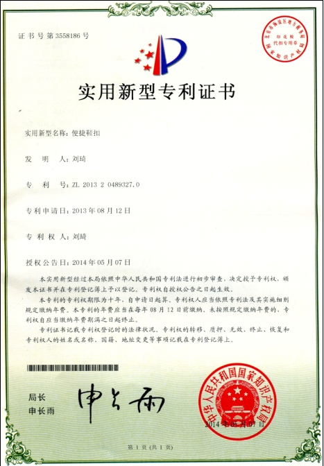 日前,从国家知识产权局传来好消息,我院11机械8班刘琦同学的发明便捷鞋扣通过国家认证,取得实用新型专利证书,专利号:ZL 201320489327.0。据了解,目前市场上的运动鞋、登山鞋多采用传统的系带式或者扣带式,由于传统式鞋扣本身的缺陷,使得每次穿鞋和脱鞋之前都要用双手进行重复操作,对于小孩和老人特别不方便,甚至一些鞋扣存在自解或者死扣的可能性。因此,一种结构简单、实用方便的新型鞋扣无疑有着广阔的市场前景。刘琦同学通过反复的思考和实践,经过前期大量的市场调研和制鞋企业实地考察,综合运用所学机械设计原理和Solidworks、CAD等三维软件的辅助,成功开发了一种新型便捷鞋扣。该鞋扣包括外壳、内棘轮、棘爪、挡块和松紧调节按钮等组成部分。使用时,鞋带首先穿过外壳底部的方形孔,按压挡块,压紧预紧弹簧,松开挡块,在预紧弹簧的作用下,内棘轮实现反向锁紧;如果觉得鞋带太紧或者需要将鞋子脱掉时,则通过按压松紧调节钮将棘爪向下按,使内棘轮反向转动,达到松紧鞋带的目的。此外,两根鞋带的尾部可以折成蝴蝶结或自己喜欢的图形放置在外壳前侧板上,美观大方。该新型便捷鞋扣结构简单,设计巧妙,使用方便,成本低廉,已经推出就广受好评。目前已经有数家鞋类企业联系洽谈,有望投入批量生产。
