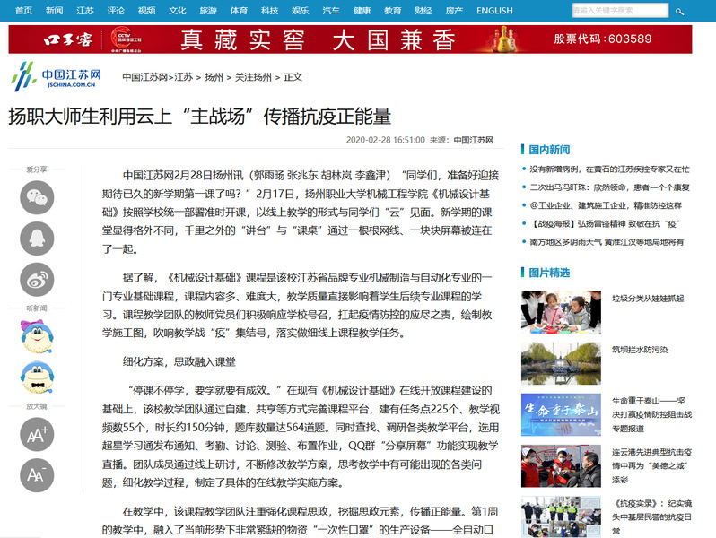 “我们虽然不能像医护人员那样冲到一线去救死扶伤,但我们可以把课上好、把学生培养好,这是做教师的本职工作,也是对防疫工作的最大支持!停课不停教、停课不停学,我们用这种特别的方式翻开了新学期的序章。”这就是扬州职业大学《机械设计基础》教学团队的战“疫”誓言,老师们还将会始终按照“标准更高、质量更好、吸引力更强”的要求开展好在线教学,落实做细教学任务,在这场抗疫大考中书写合格答卷。