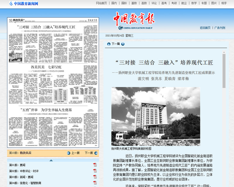 扬州职业大学机械工程学院创新的“三结合”包括:专业建设结合企业需求、人才培养方案结合岗位职业标准、教学内容更新结合先进技术,为人才培养探索了新路经。