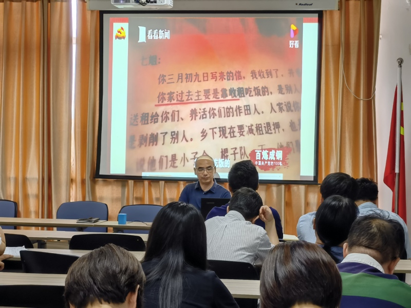 专题党课主讲人学院副院长张友宏以时间为轴,以“民以食为天,食以地为本”为主题,从大革命失败后到新中国成立前、新中国成立后到改革开放前、改革开放以来等三个阶段,再次研读了中国共产党主导的历次土地改革,将丰富的视频资料与文字材料相结合,充分展现了我们党“以人民为中心”的土地政策不断进化的动态过程。