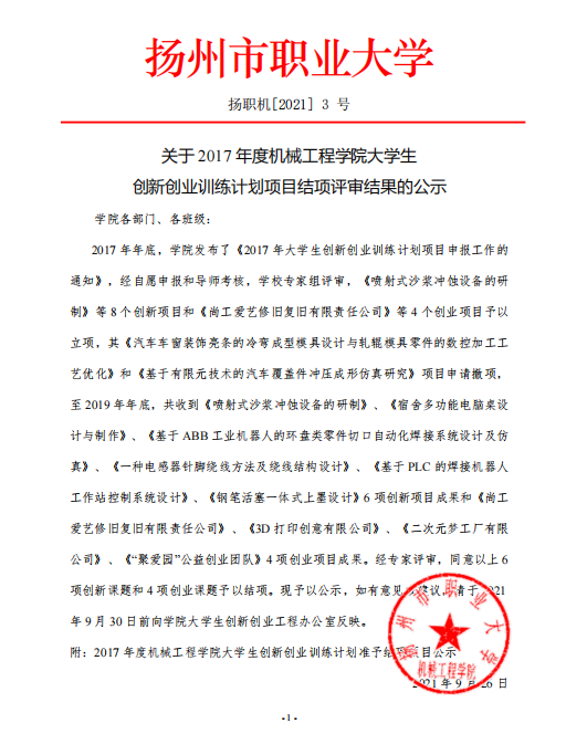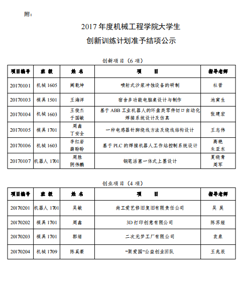 关于 2017 年度机械工程学院大学生 创新创业训练计划项目结项评审结果的公示