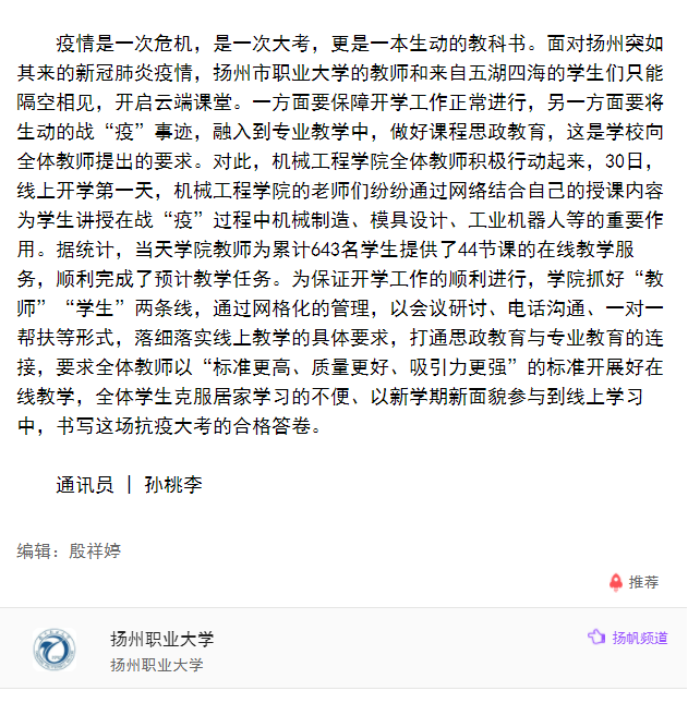 挖掘“微”素材 做好“云”相聚—— 扬州职业大学教师用“疫”线案例让课程思政有料更有心