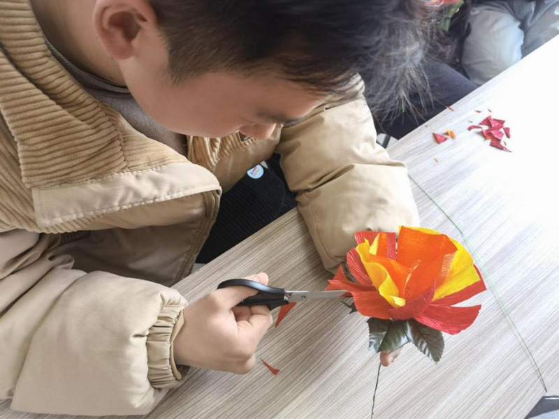 近日,机械工程学院教师和男生代表齐聚图书馆908会议室,秘密为学院女生准备独一无二的专属礼物。他们先将彩色纸折成花状,又拿起剪刀精心修剪花蕊和花瓣,最终制作成一朵朵永不凋谢的火红“石榴花”。通过线下线上方式,送给了在校和因疫情尚未返校的女生。