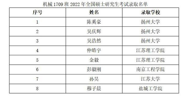 随着2022全国研究生入学考试复试结果的陆续公布,机械工程学院机械制造及自动化3+2专业(机械1709班)考研喜报频传,截止目前,共有8人考取硕士研究生。
