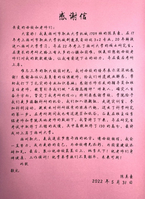 “李老师,咱们班已有8人考研上岸了!”机械1709班团支书陈奚豪激动地向班主任李铭老师报告了这个好消息。“恭喜你们!你们在学校的刻苦努力终有回报!”李老师祝贺道。机械1709班陈奚豪在向母校报喜的同时,还寄来了一封感谢信。