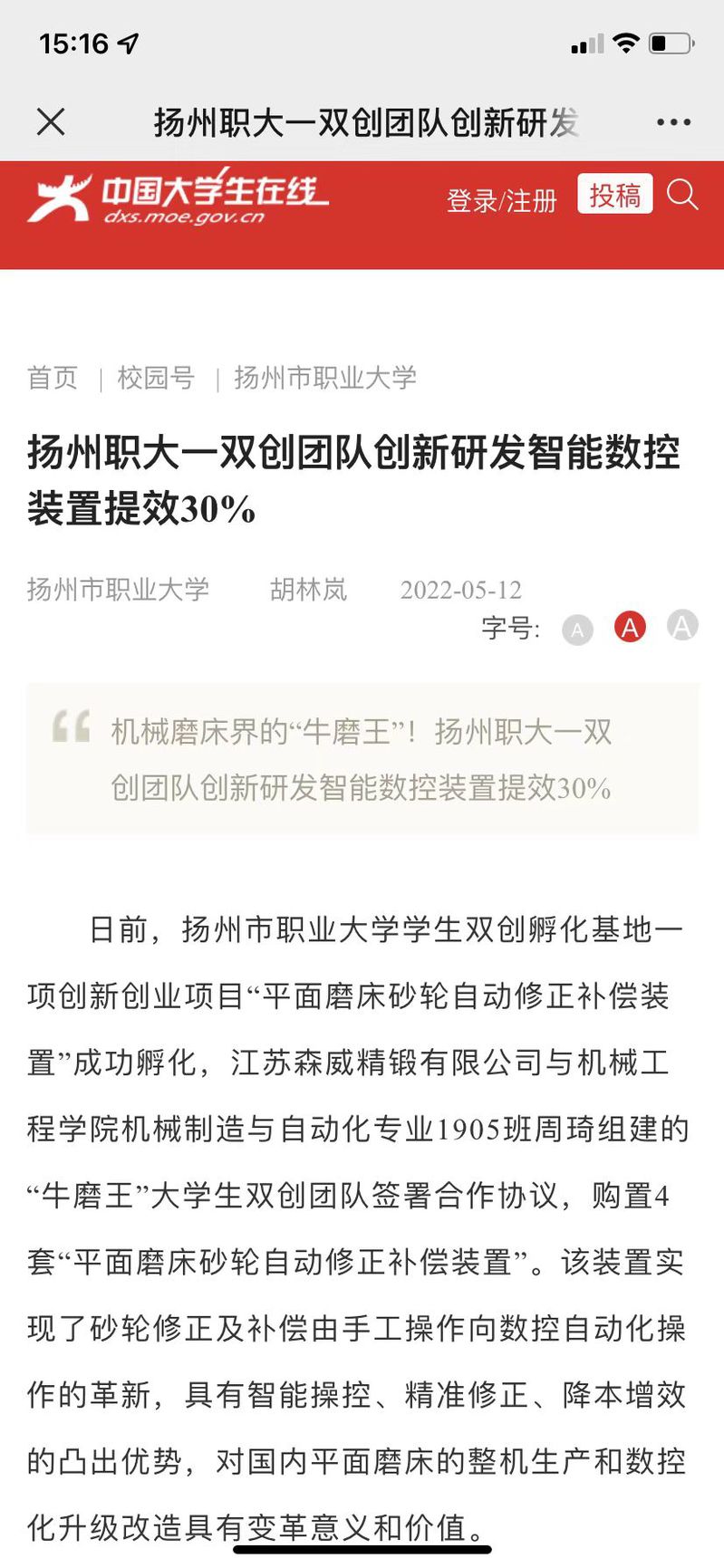 扬州职大——双创团队创新研发智能数控装置提效30%