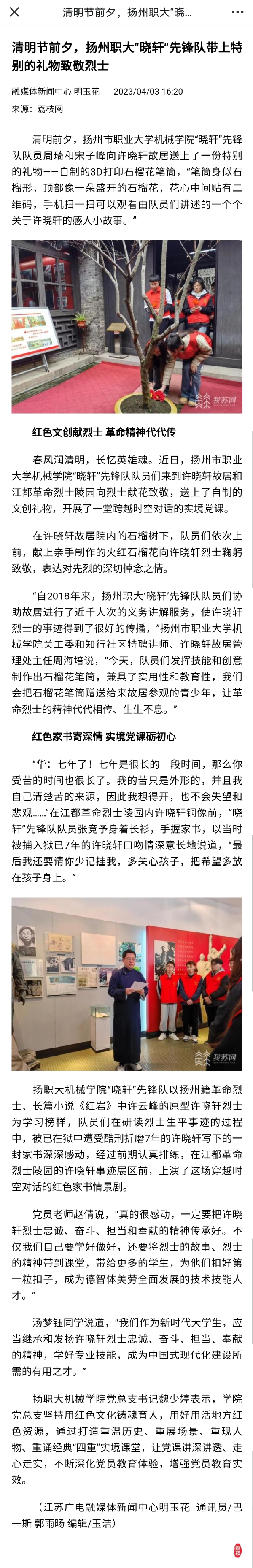 清明节前夕,扬州职大“晓轩”先锋队带上特别的礼物致敬烈士