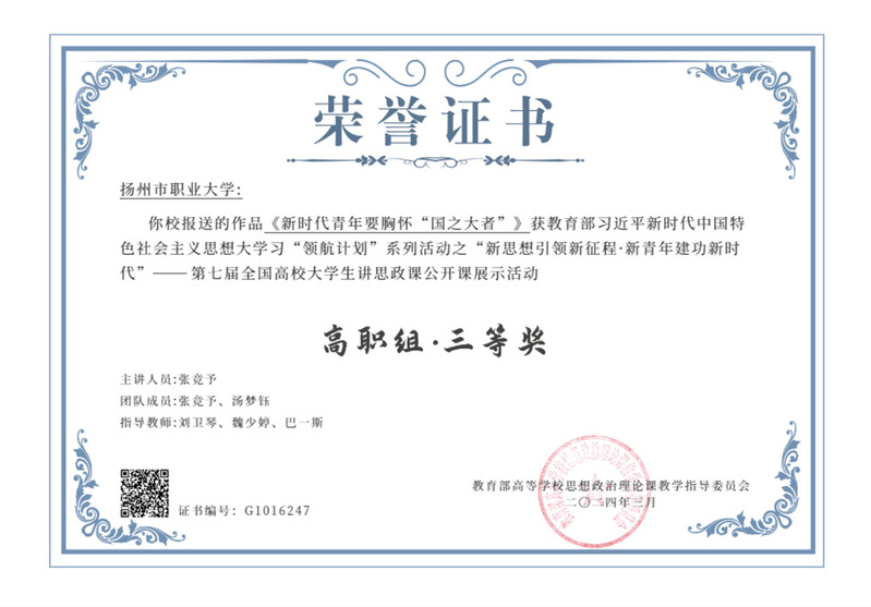近日,教育部公布了“新思想引领新征程·新青年建功新时代”第七届全国高校大学生讲思政课公开课展示活动获奖名单,学校报送的我院《新时代青年要胸怀“国之大者”》荣获高职组三等奖,这是学校在此类比赛中的新突破。