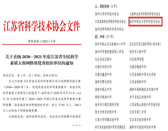 近日,江苏省科学技术协会下发《关于表扬2020—2021年度江苏省全民科学素质大赛网络赛优秀组织单位的通知》,我校科学技术协会获全省高校科协组别优秀组织单位称号。2020—2021年度江苏省科学素质大赛网络赛于2020年9月25日—12月31日举办。在市科协的关心下,我校科协积极宣传发动,医学院、信息学院、电汽学院、电子学院、园林学院、资环学院、生化学院、机械学院、土木学院等学院积极组织,全校师生近2000人参赛,为提升我市公民整体科学素质和社会文明程度贡献了扬州职大力量。