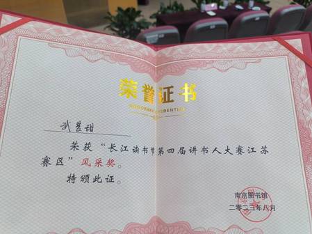 近期,江苏省图书馆学会传来了令人振奋的消息——我校荣获长江读书节第四届讲书人大赛江苏赛区组织奖,旅游学院旅游2202班的杰出学子武梦甜同学获得了长江读书节第四届讲书人大赛江苏赛区风采奖。这一精彩赛事由南京图书馆主办,自今年4月28日至8月18日,历经线上初赛、线上复赛和线下决赛,历时四个多月。