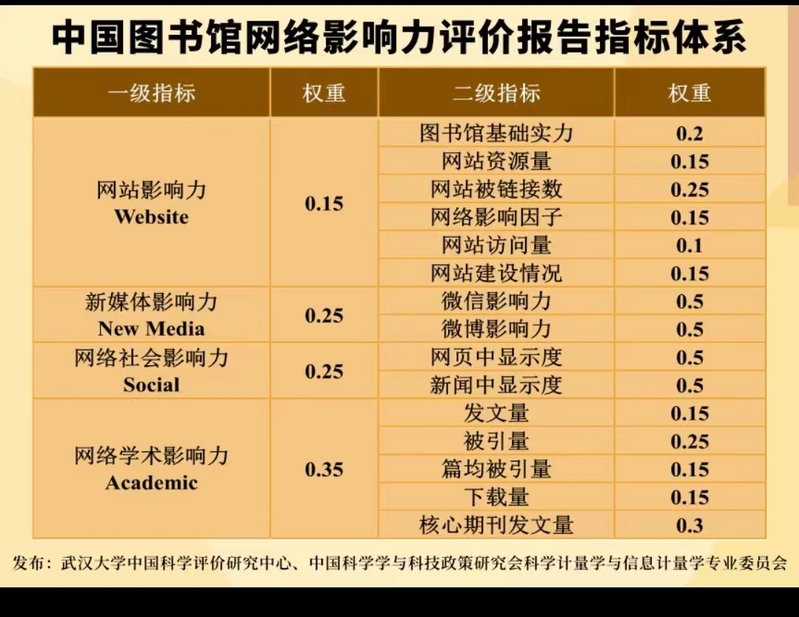 作为国内首个图书馆网络影响力评价报告,该报告构建了中国特色的图书馆网络影响力评价体系,评价指标强调代表性、可操作性、权威性、新颖性等,以求全面、科学、客观、准确地反映我国图书馆网络影响力。