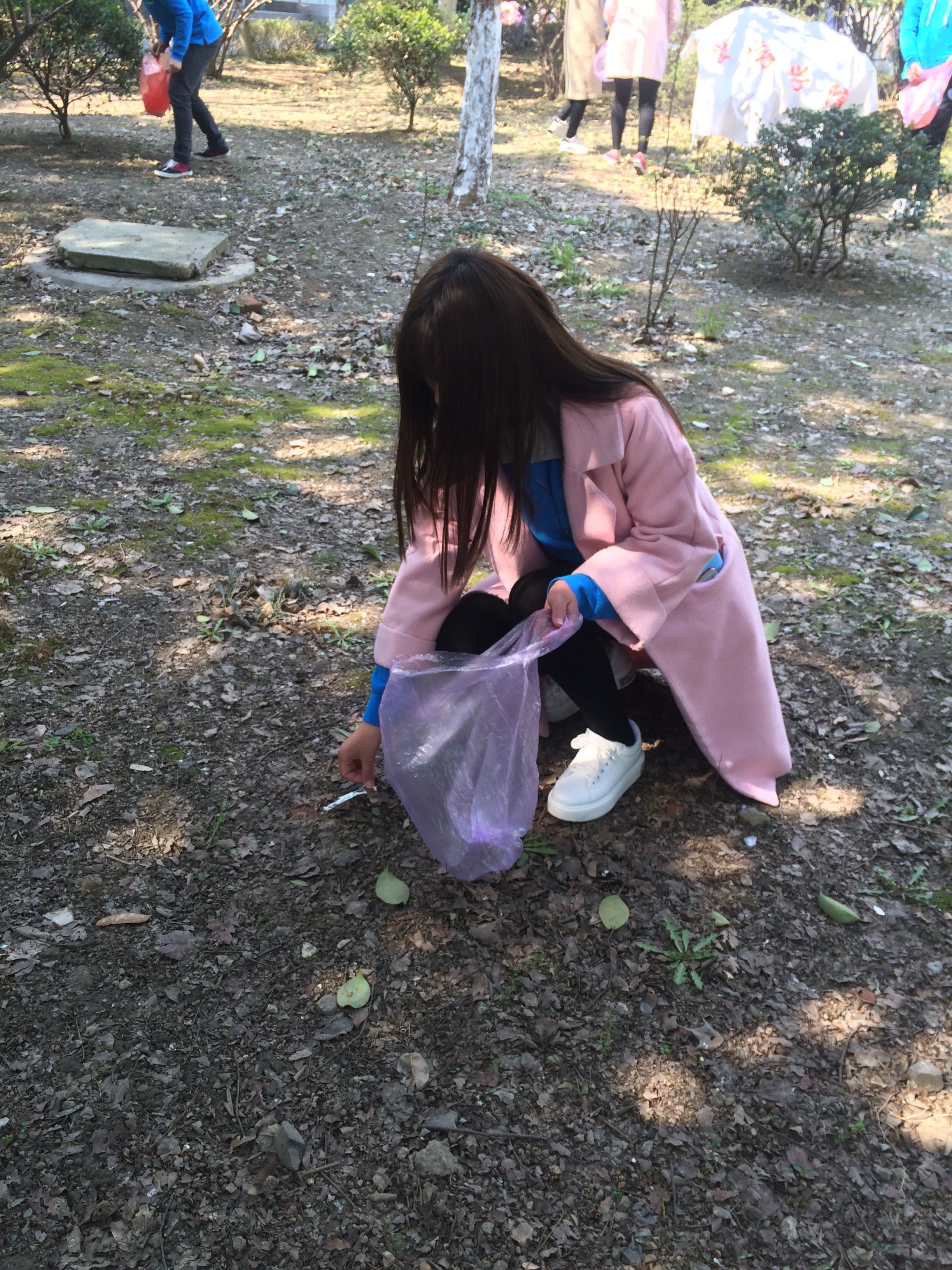 栋楼的花圃旁。“环保小纵队”分成两个小分队,一个小分队将花圃中的垃圾清理掉,另一个小分队则向周围的学生宣传保护环境的重要性。