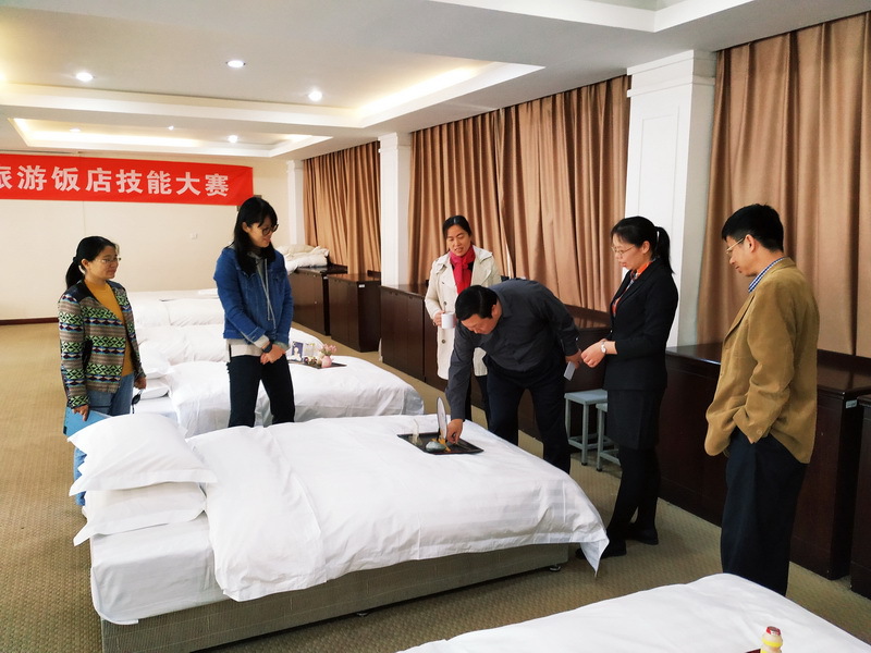 由于近年来国家职业资格证书进行了大幅度删减,取消了旅游饭店服务相关的职业资格证书。为了落实学校加强职业技能竞赛的精神,提高学生的职业技能,强化“以赛促练”,实现课、证、赛一体化教学,从2017年开始,旅游学院对酒店管理专业的人才培养方案进行了调整,增设了“酒店职业技能竞赛与水平认证”实践课程。本学期初,旅游学院领导和老师即开始谋划、筹备旅游饭店服务技能认证和比赛,以期实现教学目标,取得预期效果。从10月22日开始,酒店管理专业的学生投入了为期2周的职业技能集中实训、认证和竞赛;在此期间,旅游学院专业老师加班加点,从早到晚指导学生强化训练。