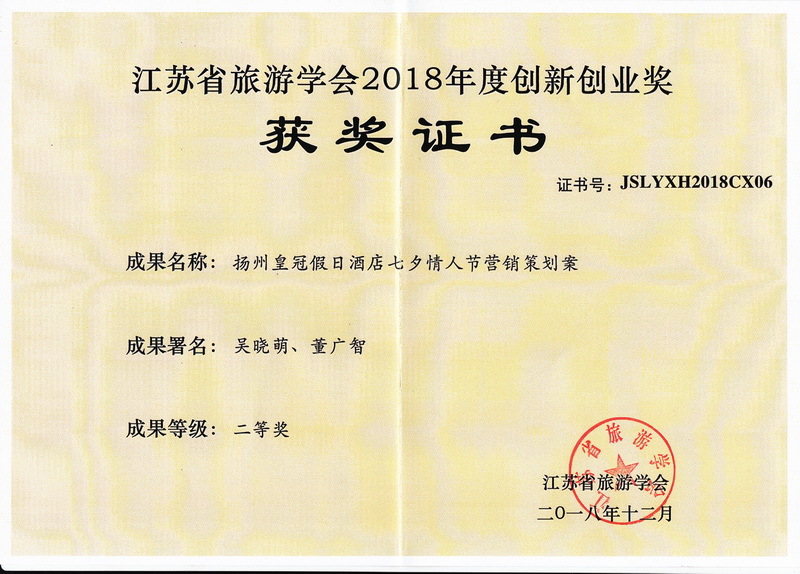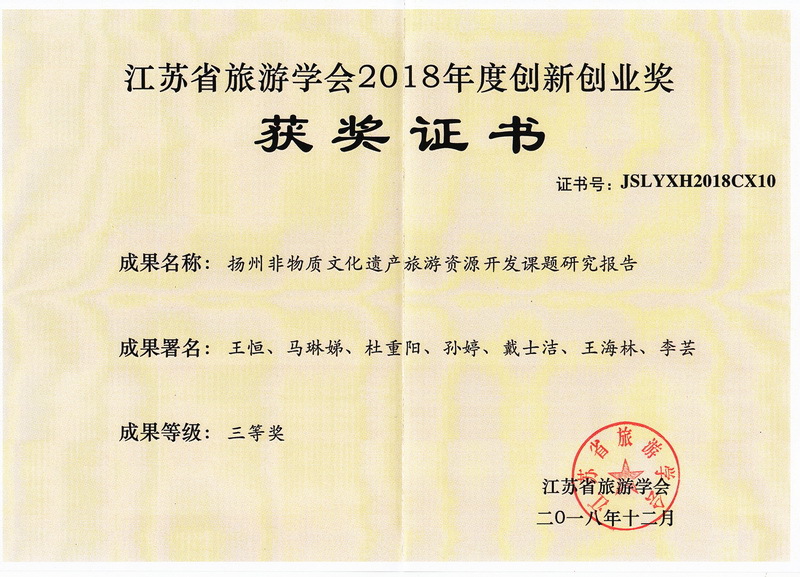 2018年12月29日,江苏省旅游学会2018年年会在南京召开。大会颁发了江苏省旅游学会2018年度创新创业奖,我校旅游学院同学吴晓萌的《扬州皇冠假日酒店七夕情人节营销策划案》获得二等奖,王恒、马琳娣、杜重阳、孙婷、戴士洁、王海林同学的《扬州非物质文化遗产旅游资源开发课题研究报告》获得三等奖。