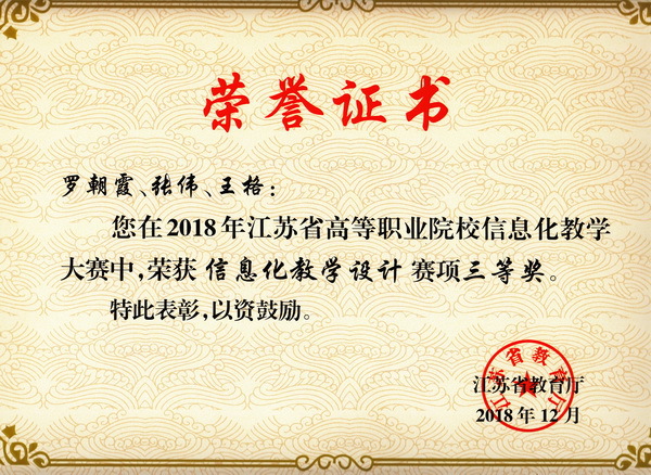 2018年12月,旅游学院罗朝霞、张伟、王格老师在2018年江苏省高等职业院校信息化教学大赛中,荣获信息化教学设计赛项三等奖。