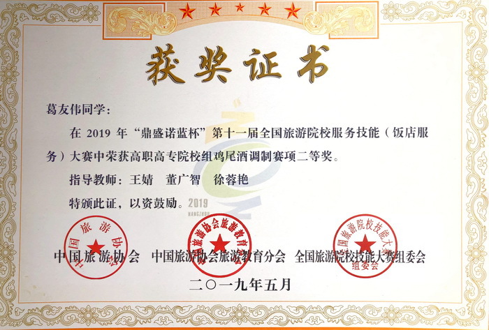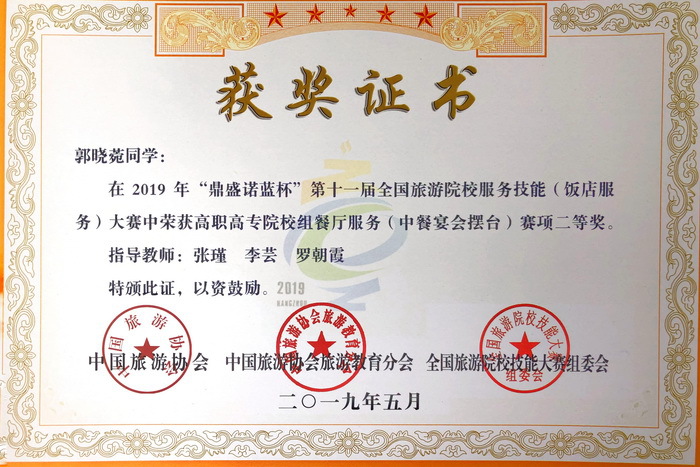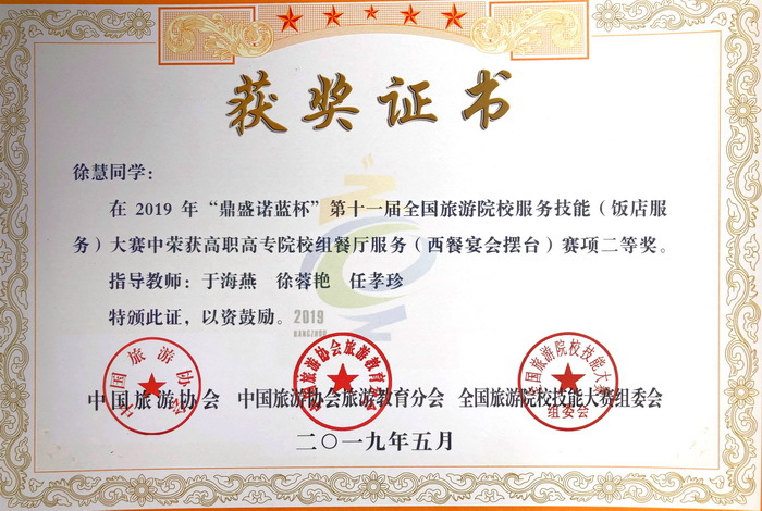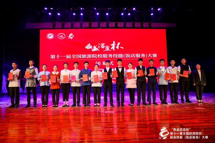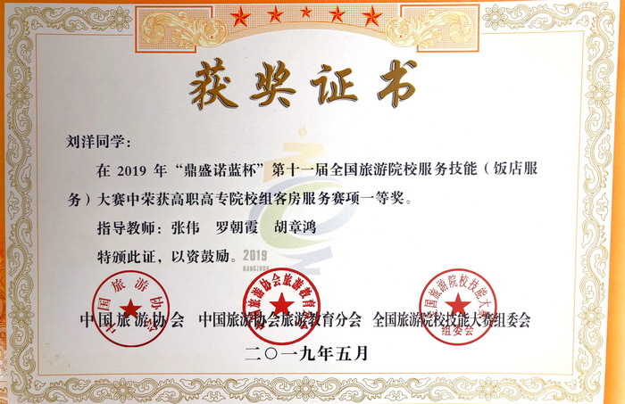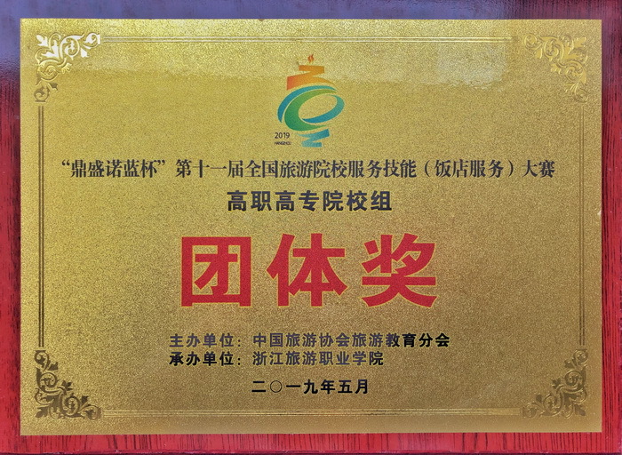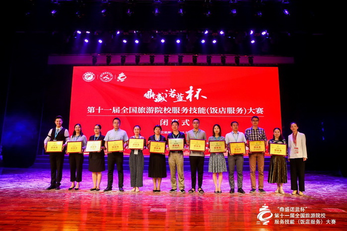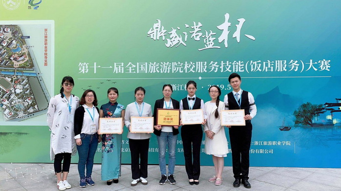2019年5月19日,第十一届全国旅游院校服务技能(饭店服务)大赛在浙江杭州胜利闭幕,我校旅游学院酒店管理专业学生荣获一等奖1项、二等奖3项,并勇夺团体奖。