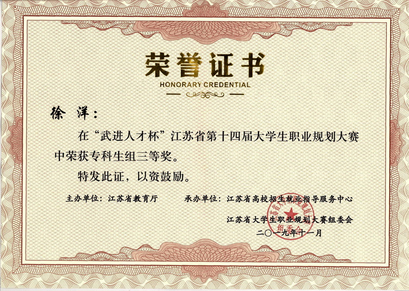 11月,酒店1903班徐洋同学在江苏省教育厅主办的“武进人才杯”省第十四届大学生职业规划大赛中,荣获专科生组三等奖,指导老师为邰仁飞。