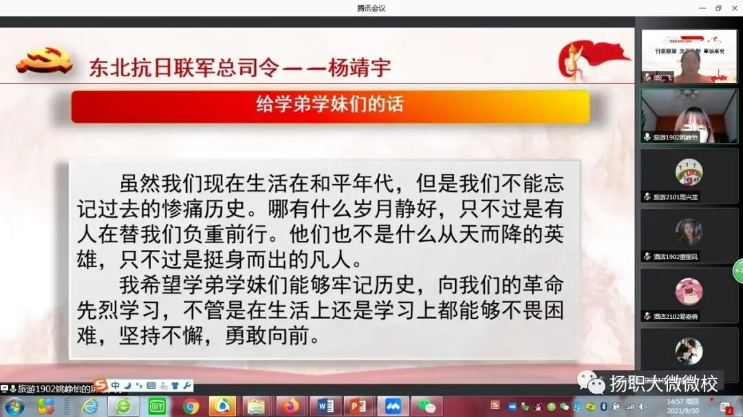 2021年9月30日上午,旅游学院学工党支部组织7名学生党员及21级98名新生一起观看了《烈士纪念日向人民英雄敬献花篮仪式》的直播。直播结束后,学生们分享了观后感。学生党员刘玉轩说:“我们虽然已经远离战火,但英烈们视死如归的精神值得我们学习、继承并发扬。礼赞英雄、学习英雄、致敬英雄。”酒店2102班的朱雨涵说:“作为新时代的青年,我们不仅缅怀英烈,更应该学习他们的爱国精神、奉献精神,请党放心,强国有我。”