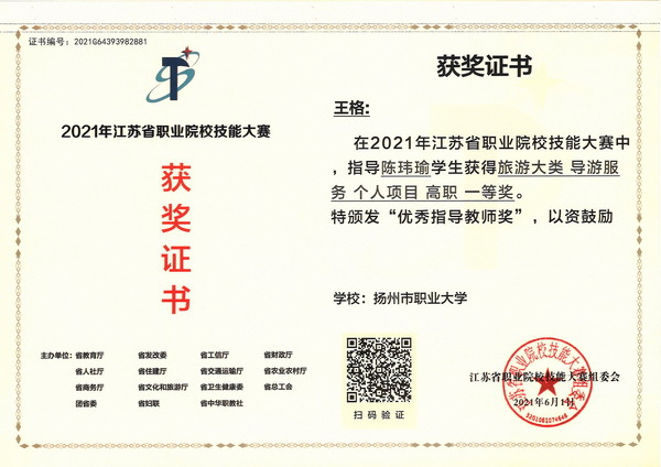 4月8日至11日,2021年江苏省职业院校技能大赛导游服务赛项(高职组)在江苏海事职业技术学院举行,来自全省44所高职院校共83位优秀选手同台竞技。betway必威中文版 旅游学院学生获一等奖、二等奖。