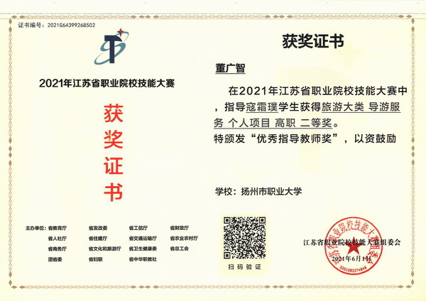 经过导游知识理论测试、导游词创作及讲解、自选景点导游讲解、英语情景对话和应景才艺运用共五个环节的比拼,陈玮瑜同学获得一等奖,寇霜璞同学获得二等奖。我校成为全省唯一连续4年获导游服务赛项一等奖的旅游院校。
