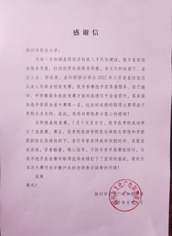 扬州市文化广电和旅游局对我校旅游学院的助力给予了肯定和赞许。