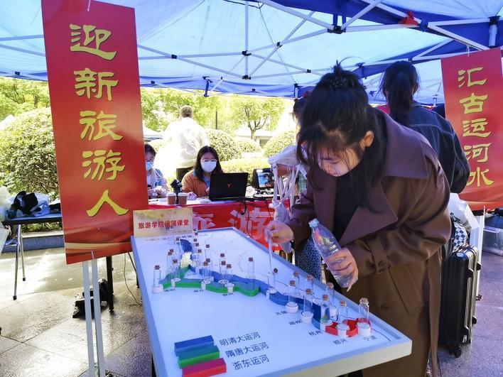 原来,早在开学前,学院就给新生们布置了一个特殊的作业:住在运河沿线地区的同学们可带来家乡的运河水,其他地区的同学则带来一罐家乡的土。报到现场,来自杭州的新生王秋怡带来了家乡的水。只见不同地区的水被灌注在小小的玻璃瓶里,立在地图上的各个运河沿线城市点上。