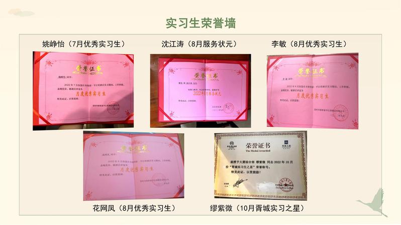 平江府大酒店实习的沈江涛获评“8月服务状元”,姚峥怡获评“7月优秀实习生”,李敏、华网凤获评“8月优秀实习生”,在胥城大厦实习的缪微获评“胥城实习之星”。
