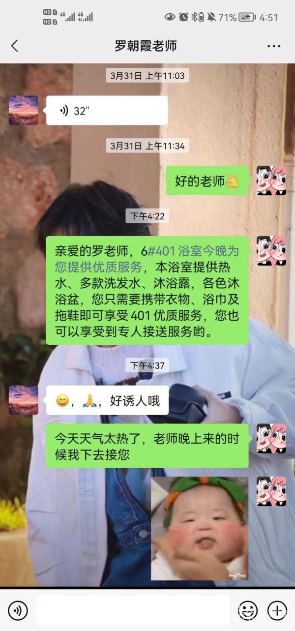 亲爱的罗老师,6号楼401浴室今晚为您提供优质服务,本浴室提供热水、多款洗发水、沐浴露,各色沐浴盆,您只需要携带衣物、浴巾及拖鞋即可享受401优质服务,您也可以享受到专人接送服务哟。”这是betway必威中文版 旅游学院罗朝霞老师收到的一条微信,短短的几行字让罗老师感动不已:“昨天在走访宿舍时跟同学们提到住校洗澡不方便,只能用桶拎水到卫生间隔间洗澡,今天同学们就给我发来了这样一条短信,真的是太暖心了。”