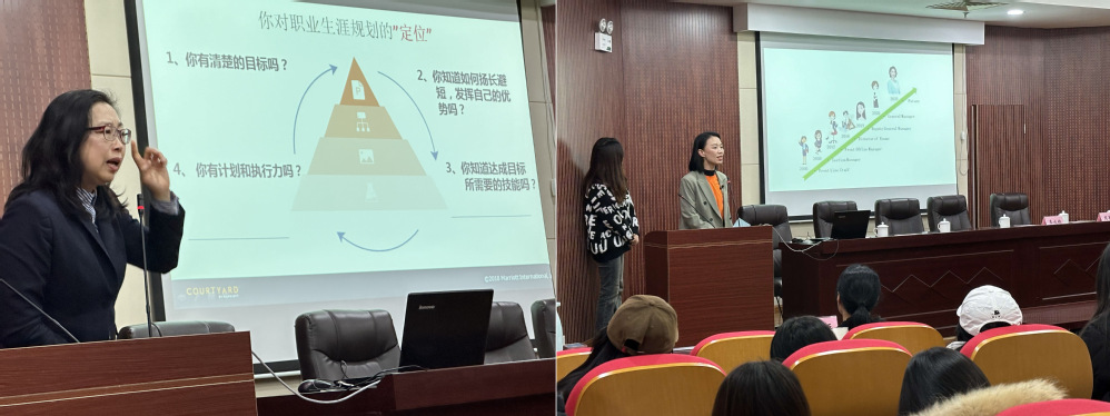 上海国际旅游度假区万怡酒店经理柯心磊女士毕业于美国加利福尼亚州州立大学,曾在美国Nobel Biocare、日本Pasona\IBM、中国Honeywell等企业工作过,她丰富的工作经历和热情洋溢的讲解让学生对旅游行业有了更加清晰、深入的了解。柯心磊还带来了6位我校实习生的祝福视频,为同学们提供了许多有建设性的意见和建议。