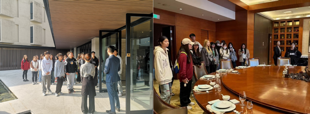 在酒店相关负责人的带领下,同学们参观了酒店的各个部门,包括前台、客房、餐厅、会议中心和康体设施,详细了解了各个部门的工作流程和运营情况,深入了解了酒店业务的各个方面。在参观过程中,同学们向酒店的工作人员请教各类专业问题,并聆听了他们在工作中的经验和技巧。各式包厢和餐厅餐具的摆放和台面的整洁程度,让同学们深刻地感受到了优质酒店的专业精神和细节关怀。