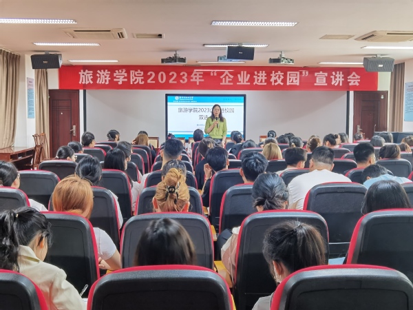 旅游学院院长张志祥对来访企业表示热烈欢迎,并与企业领导进行交流,详细了解企业人才需求,听取他们对旅游学院人才培养工作的建议,并要求企业尽量提供更多的轮岗机会,为学生提供良好的实习平台,保障实习落到实处。企业宣讲会由学院副院长罗朝霞主持,12家单位向学生详细介绍了企业文化、实习岗位、实习待遇、生活条件、成长路径等学生关注的话题。宣讲结束后,学生在三楼走廊与企业进行面对面交流,最终达成实习意向,签订顶岗实习协议。通过本次企业进校园宣讲开展实习双选会,同学们获得了实习锻炼的机会,企业遴选到了优秀的技能人才,充分实现了校企互利共赢,利于推动校企合作、产教融合向纵深发展。