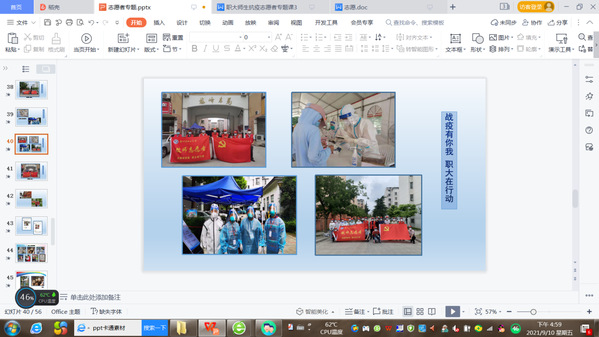 疫情是一次危机,是一次挑战,对我们来说更是一本生动、立体的劳动教育教科书。侯凤梅老师首先主要以图片、视频的形式形象生动地讲述了扬州职大师生志愿者奋勇作战、勇敢无畏的抗疫历程。