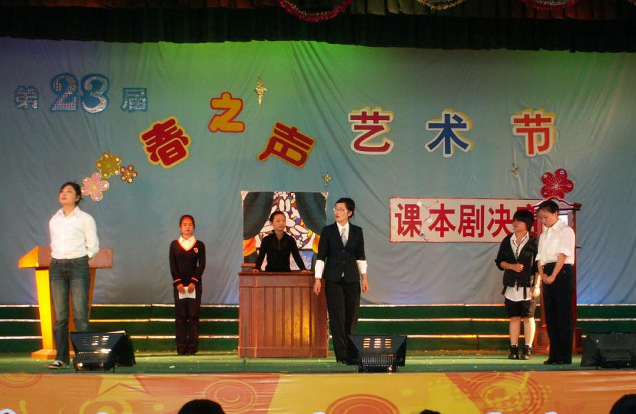 5月17日下午1时半艺术节――课本剧比赛在高邮学院大礼堂举行。在课本剧的编排上,参赛班级以中小学语文教材为参考,在此基础上自编、自创,突出爱国守法、团结友爱、勤俭自强、快乐向上的精神内涵。比赛中,不论是道具的安排,还是学生的表演,都充分展示了同学们的才华。来自06(4)班的课本剧《刘胡兰》以扣人的情节、出色的表现、深刻的教育意义获得了第一名。至此,高邮学院第23届“春之声”艺术节圆满落幕。