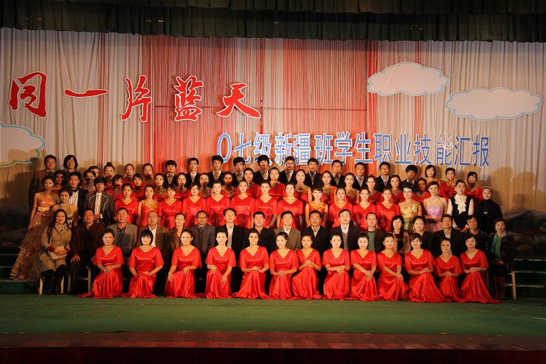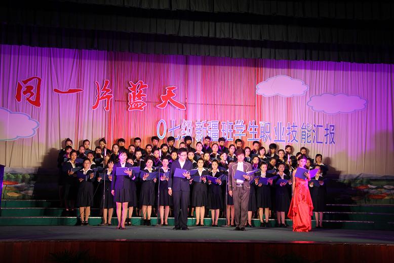 28日下午,前来交流的领导们一起观看了07级新疆班同学的职业技能汇报演出,汇报演出中展示了说课、板书、朗诵、演讲、舞蹈、演唱、器乐、课本剧等各项职业技能。