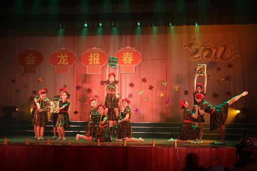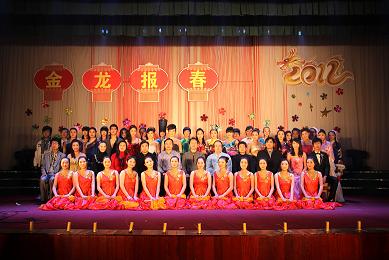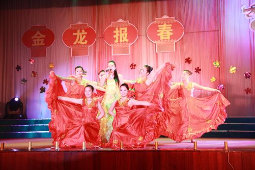 舞台背景为金光闪闪的“金龙报春”四个大字以及由2012字样组成的一条金色的飞龙所组成,寓意学院腾飞,事业辉煌。晚会在喜庆的歌舞中开场,开场后,学院党总支书记曹桂祥发表了热情洋溢的新年致辞。