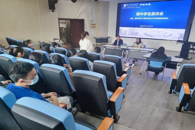 学生座谈会由学院教科研办主任杨先平主持,学院党总支副书记刘九林出席座谈并为学生们答疑解惑,部分新疆班的学生通过线上形式同步参加了座谈会。座谈中,学生们主要围绕实践教学、技能训练、疫情背景下学生活动的开展、校园文化建设、宿舍和食堂管理、大学生心理健康等问题踊跃发言。会上,与会学生所反映的问题都得到了积极的回应,大家纷纷表示,今后要更加努力学习,为今后的发展打好基础、做好准备。由于受疫情影响,新疆班的学生目前还未返校,进行线上教学,尽管大家心中有遗憾,但还是非常理解当前的疫情防控政策,同时大家也非常感谢学校给予新疆班学生的关心和关爱。