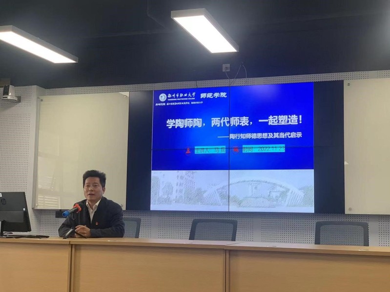 为传承陶行知教育思想和爱国情怀,加强师德师风建设,11月23日下午,师范学院开展了陶行知师德思想学习研讨活动,研讨会上师范学院实训基地主任马兵做了题为《学陶师陶,两代师表,一起塑造——陶行知师德思想及其当代启示》的专题讲座。