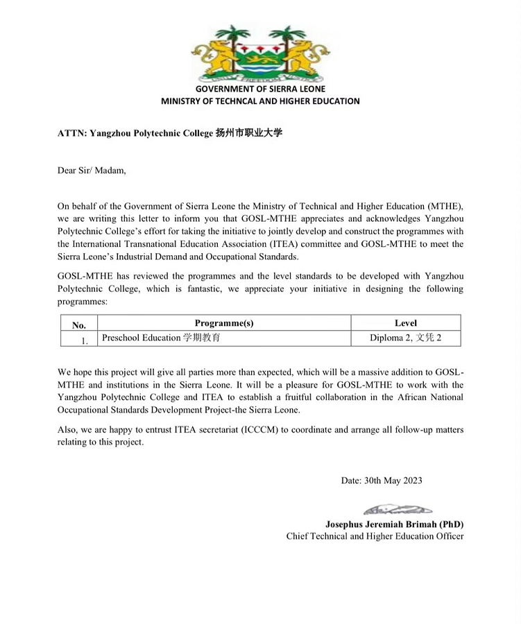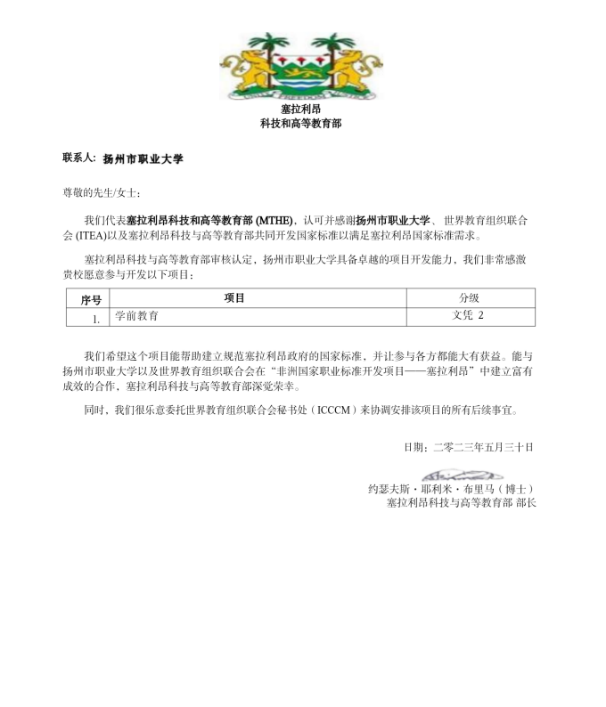 近日,我校收到了非洲国家塞拉利昂科技与高等教育部部长约瑟夫斯·耶利米·布里马博士的来函,师范学院厉爱民、金本能牵头申报的“非洲国家职业标准开发项目一一塞拉利昂”获得立项,本次立项的为“学前教育(文凭2)”的国家职业标准开发项目。立项建设单位的遴选工作由世界教育组织联合会(ITEA)于今年3月份组织开展,我校能够在国内众多职业院校竞争中脱颖而出,并能够得到塞拉利昂教育部的认可,也充分说明了学校整体办学水平的进一步提升。