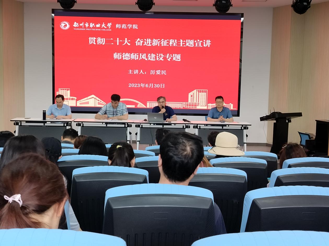 会上,厉爱民宣讲了习近平总书记关于教育的有关论述,并带领大家学习领会习近平总书记关于师德师风建设的系列重要讲话。厉爱民要求大家,要认真学习贯彻党的二十大会议精神,要深刻领会习近平总书记关于教师要努力做学生的“四个引路人”和“四有好老师”的讲话精神。厉爱民强调,大家一定要坚持立德树人根本任务,要学用结合,人人都要争当“最美职大人”。