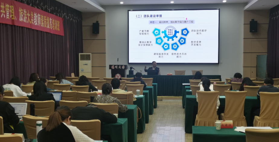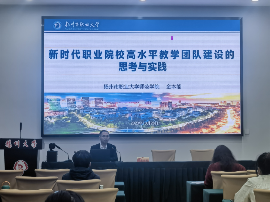 10月28日上午,师范学院副院长金本能教授应扬州大学邀请,为2023年福建省中职学校艺术、公共管理及旅游大类专业骨干教师培训班学员做了题为《新时代职业院校高水平教学团队建设的思考与实践》的学术报告,该培训班由扬州大学具体承办,来自福建省中职学校参训教师40余人到会听讲。