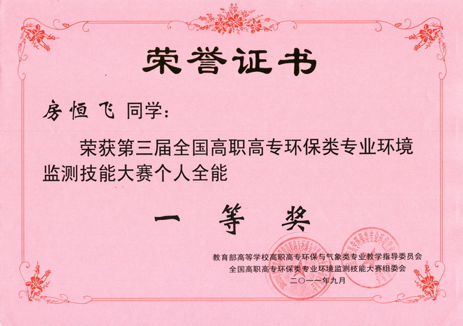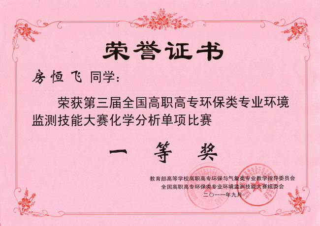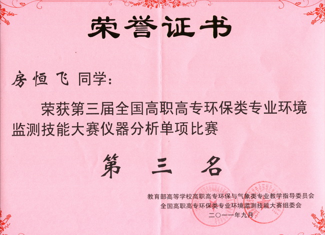 2011年9月2日,第三届全国高职高专环保类专业环境监测技能大赛在扬州环境资源职业技术学院举行,本次大赛有来自全国的35所院校、37个代表队、共150多名同学参加。我校由生化工程系主任于智勇教授带队参加大赛。经过三天的激烈角逐,我校代表队共获得一等奖4项,二等奖1项,三等奖4项。房恒飞同学在仪分项目中,更是从众多同学中脱颖而出,获得第三名的佳绩。