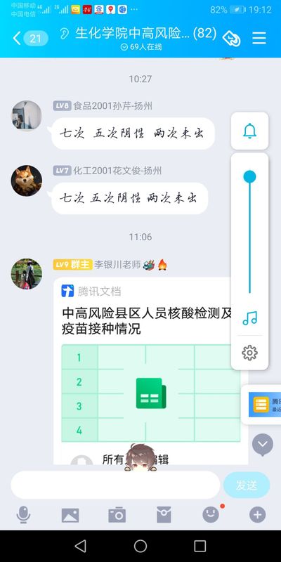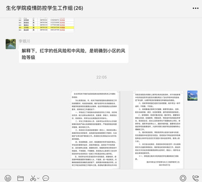 四个新建群。为了更加紧、更加严、更加实、更加快地做好学生疫情防控工作,学院辅导员李银川牵头新建了“生化学院疫情防控工作小组”、“生化学院疫情防控学生工作组”两个微信群、“生化学院中高风险地区学生”、“生化学院疫情防控学生工作”两个QQ群。相关人员根据工作需要按类入群。其中“生化学院中高风险地区学生”QQ群对学生进出实行动态管理。各个群内交流信息、讨论数据、共享资源非常便捷,提高了工作效率。为了保证统计数据精准,上报资料符合要求,辅导员李银川每天既要留意学校各类群下发的通知,又要关注学院相关群的信息。群中反映有两名学生存在心理困惑,辅导员吴美瑾的心理疏导工作立即跟进。群中一个询问,班主任或班长立刻作出回应。