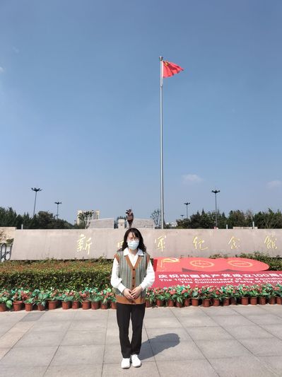 药技1902班严孙悦同学也是一名中共预备党员。10月1日上午,她早早来到了家乡盐城的新四军纪念馆,在实景中进行一次党史学习,接受一次爱国主义教育,并在飘扬的国旗下留下青春风采。