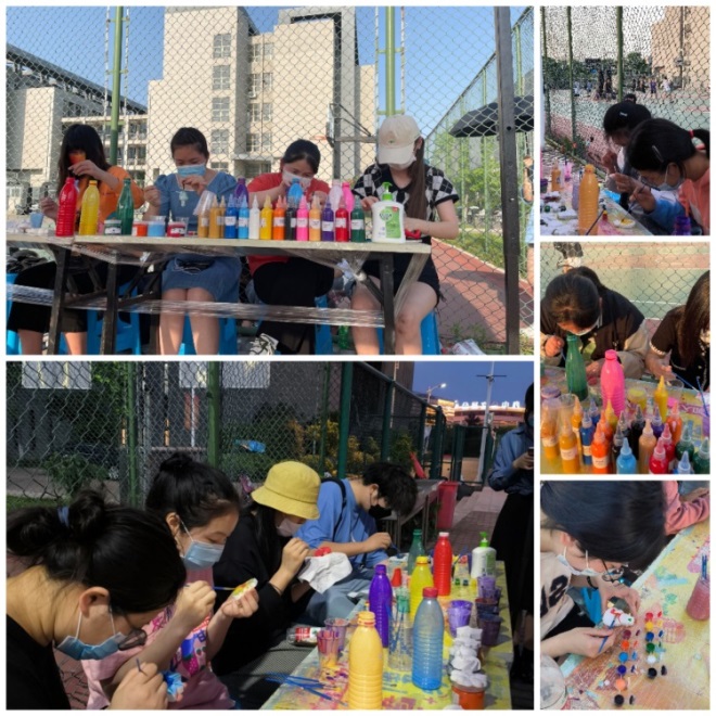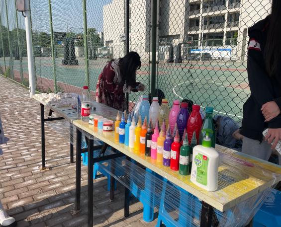 工欲善其事,必先利其器。为了让同学们能够尽情享受艺术的快乐,活动当天,院学生会副主席张盼盼、吴昊以及其余学生会干部早早来到校运动场布置场地。准备好酒精和免洗洗手液,摆上流体熊和石膏娃娃,铺展好作画的染料。活动还没有正式开始,同学们已自觉排起了长长的队伍。专人负责测体温、依次给活动参与者编号……院学生会干部忙得不亦乐乎,各项组织工作井井有条。