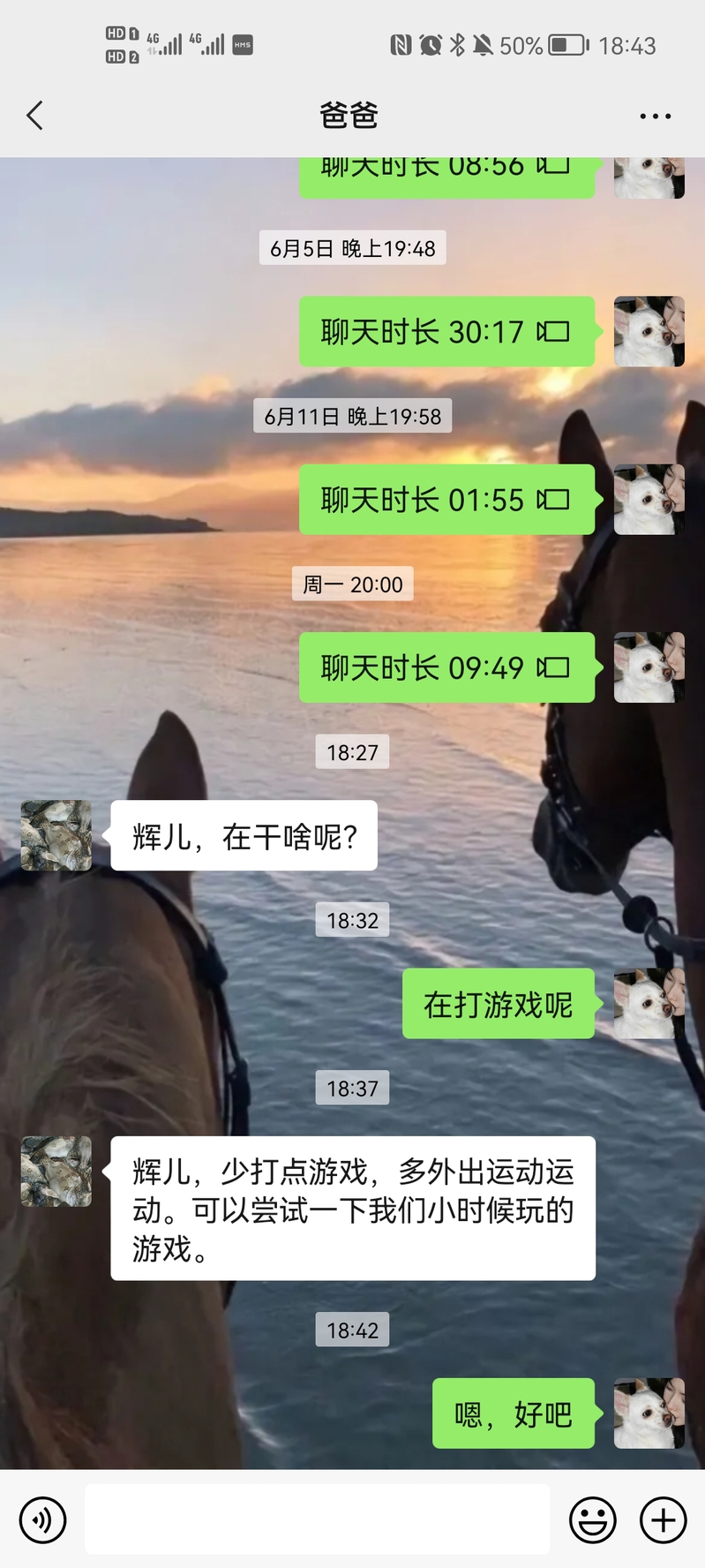 “辉儿,在干啥呢?”“在打游戏呢。”“辉儿,少打点游戏,多外出运动运动。可以尝试一下我们小时候玩的游戏。”这是近日彭佳辉同学与其父亲的聊天记录。