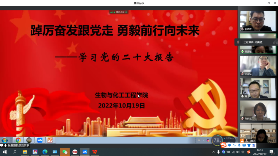 10月19日下午,学院全体教职工齐聚云端,院党总支委员吴美瑾带领大家依次学习了《一图速阅二十大报告》《二十大报告金句》《9个数字!带你速读二十大报告》等内容。大家围绕深刻领会党的二十大精神内涵,切实推动学院各项工作高质量发展进行了深入交流。会上,程爱民院长希望全体教职工切实把思想、认识和行动统一到党的二十大精神上来,以更加务实的态度、更加扎实的工作,为学院发展添砖加瓦。院党总支副书记陈久安提出,党的二十大报告为今后的工作指明了方向,全院教职工要全面贯彻党的教育方针,立足岗位履职尽责,践行“一线工作法”,教育和引导青年学生坚定不移听党话、跟党走,为培养担当民族复兴重任的时代新人作出自己的贡献!学院教职工纷纷表示一定要牢记教育初心和使命,在二十大精神的引领下踔厉奋发、勇毅前行,切实把学习成效转化为做好自身工作的强大动力。
